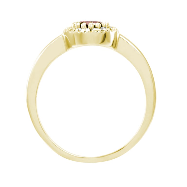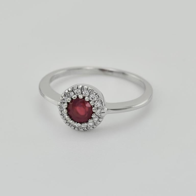 • der Rubin erstrahlt in einem Halo aus Diamanten und Weißgold