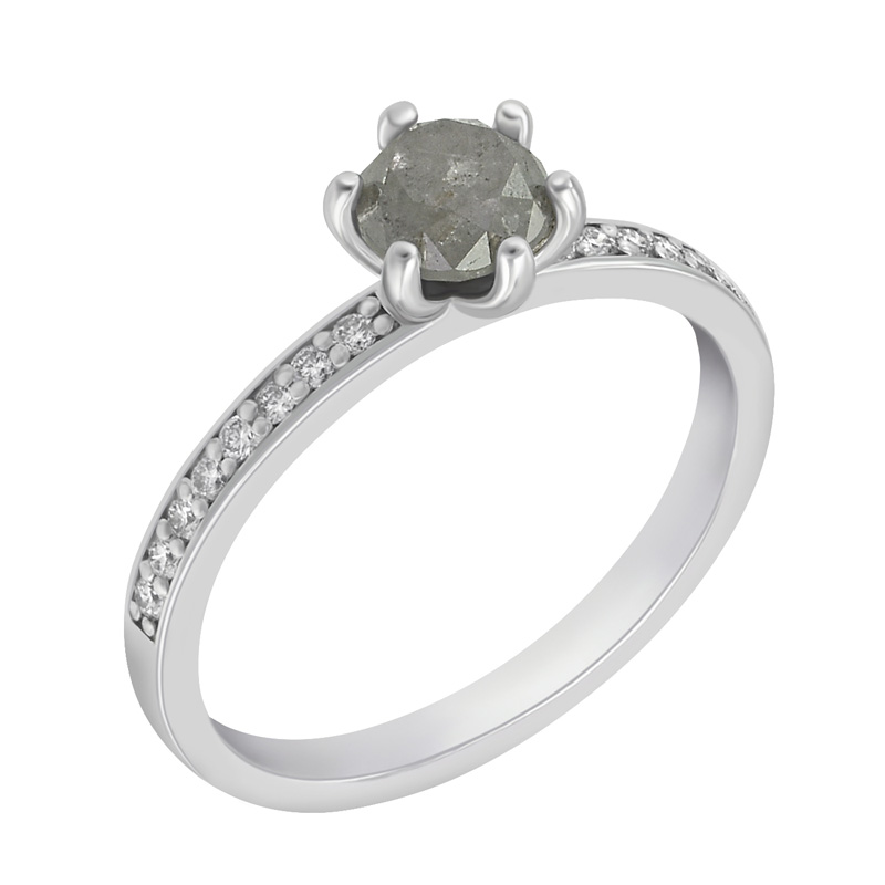 • der salt and pepper Diamant wird mit weißen Diamanten in einem goldenen Verlobungsring kombiniert