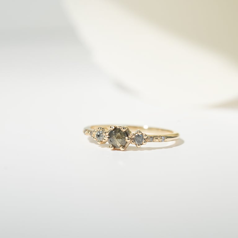 • drei graue Salt and Pepper Diamanten als Hauptsteine werden von vier grauen Diamanten im Ring umrahmt