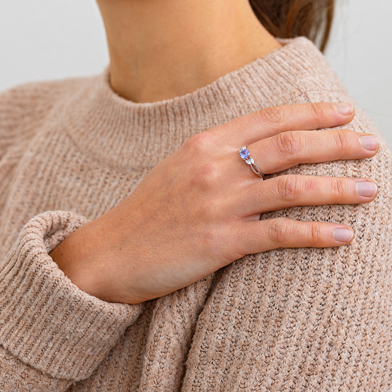 • der natürliche Tansanit in der Mitte des Rings hat eine schöne blau-violette Farbe und hebt sich von dem verschlungenen Ring ab