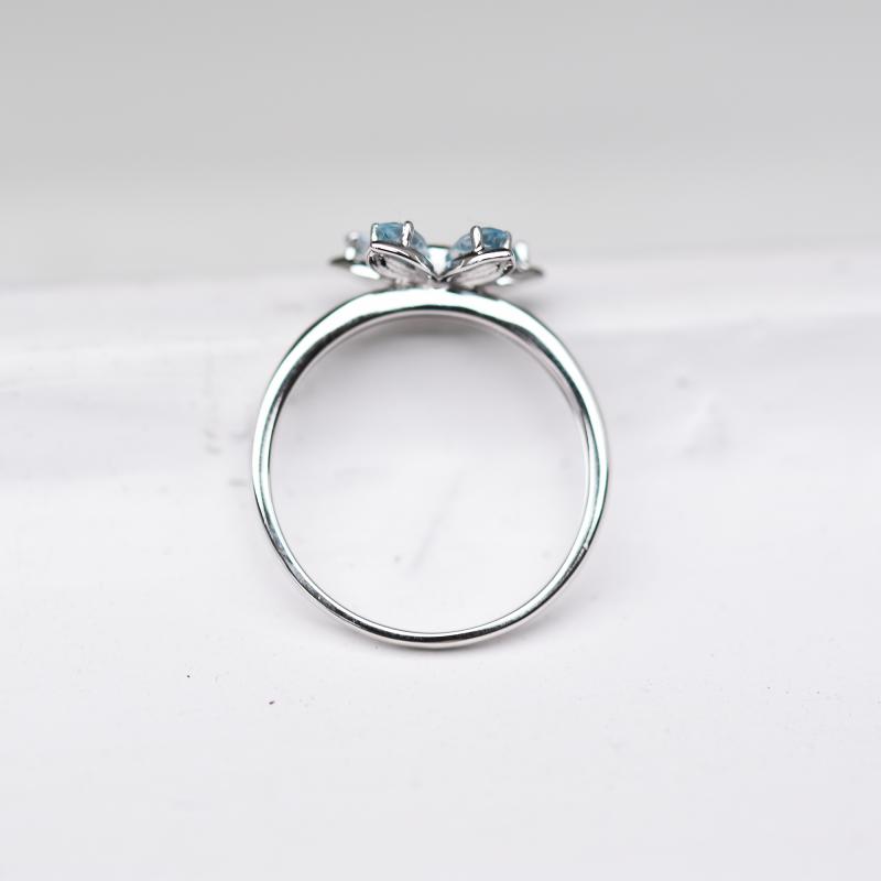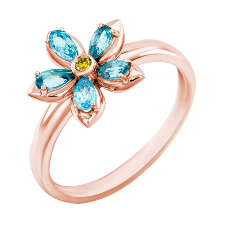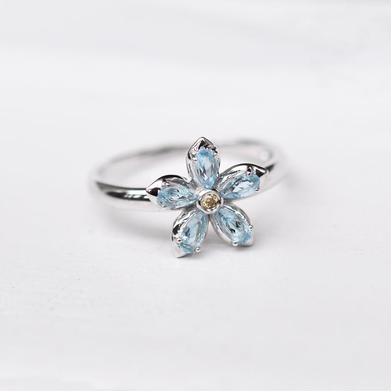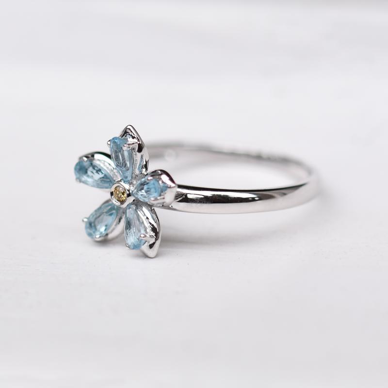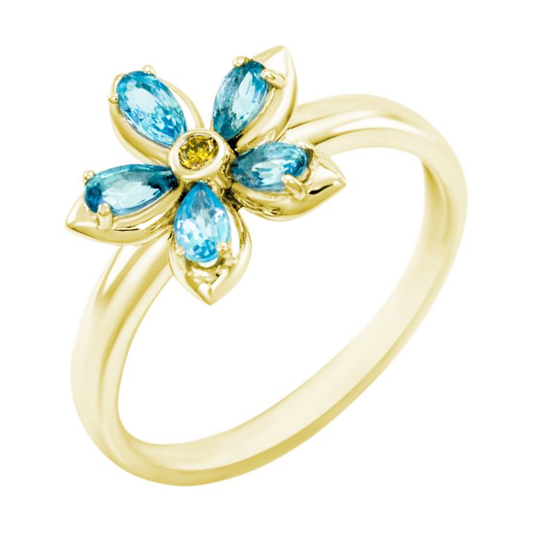 • zart und bezaubernd sitzt ein Vergissmeinnicht aus dem zentralen gelben Diamanten und himmelblauen Topasen auf diesem Ring