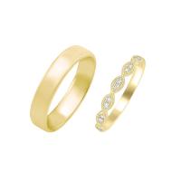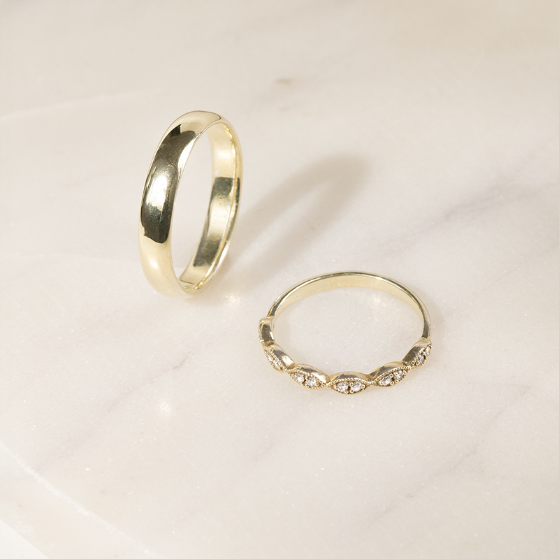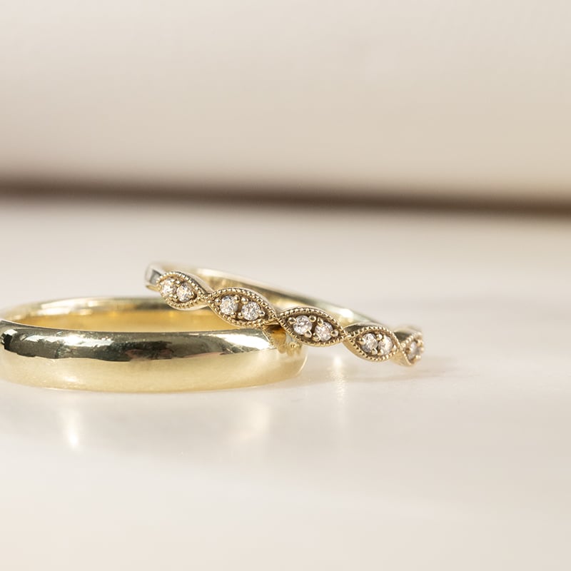 • ein zartes Paar Trauringe aus recyceltem Weiß-, Gelb- oder Roségold