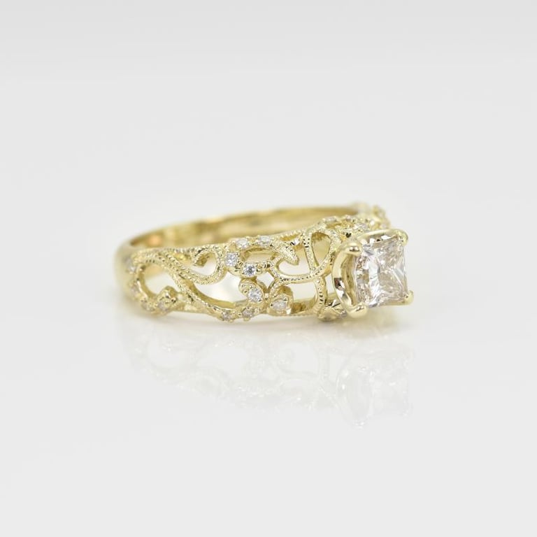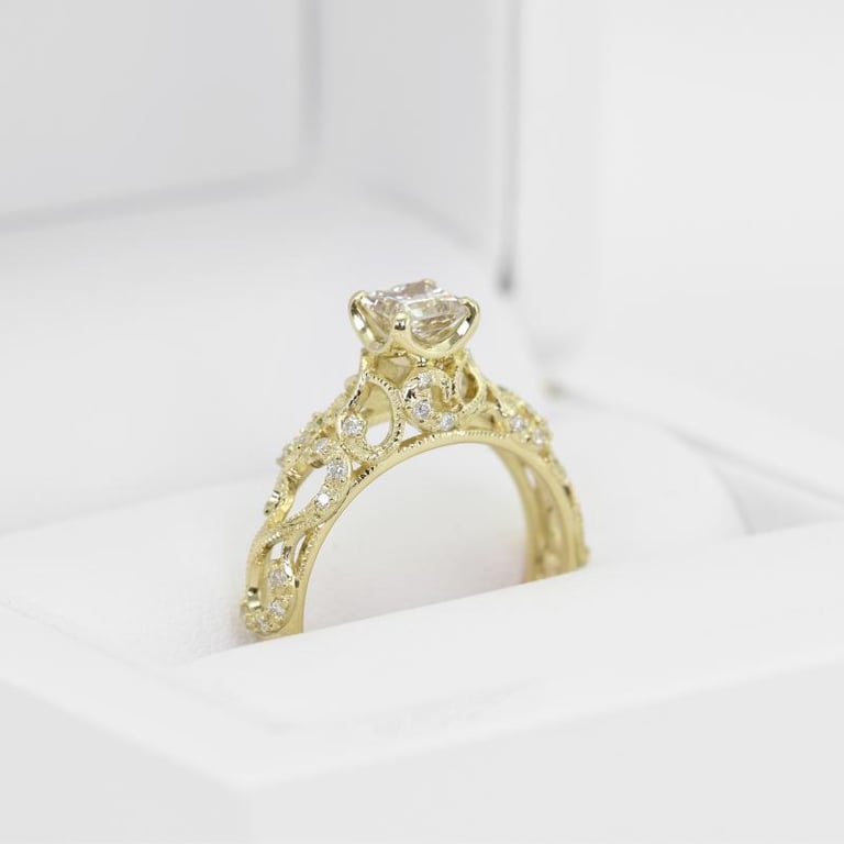 • der verzierte Ring in Gelbgold wird Ihnen durch die vielen Diamanten den Atem rauben