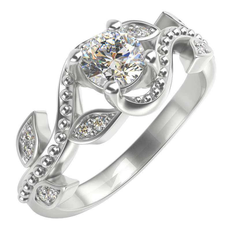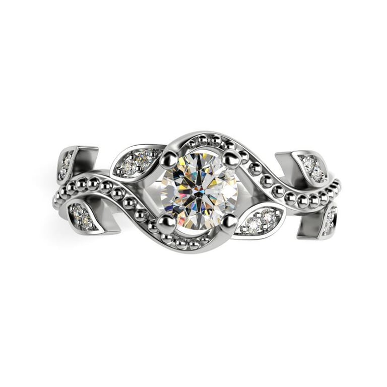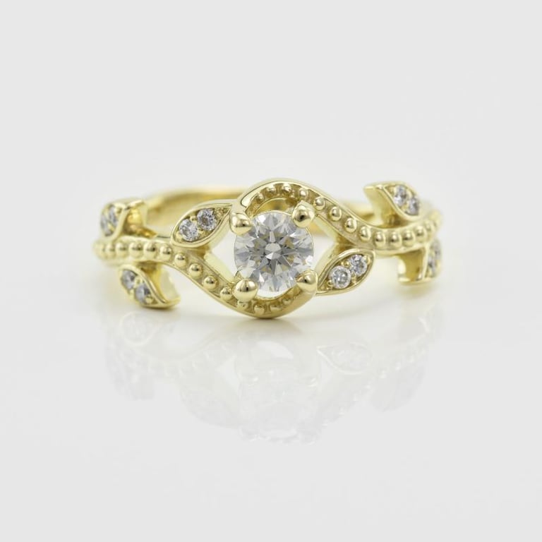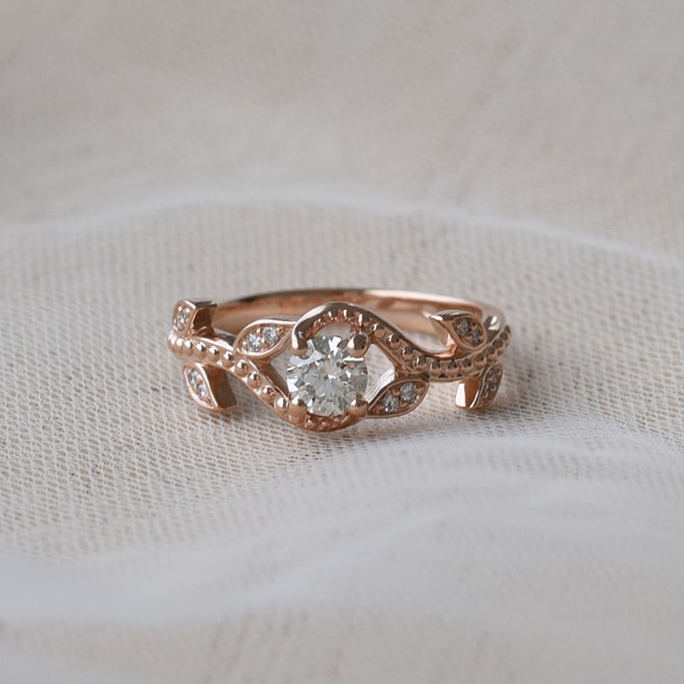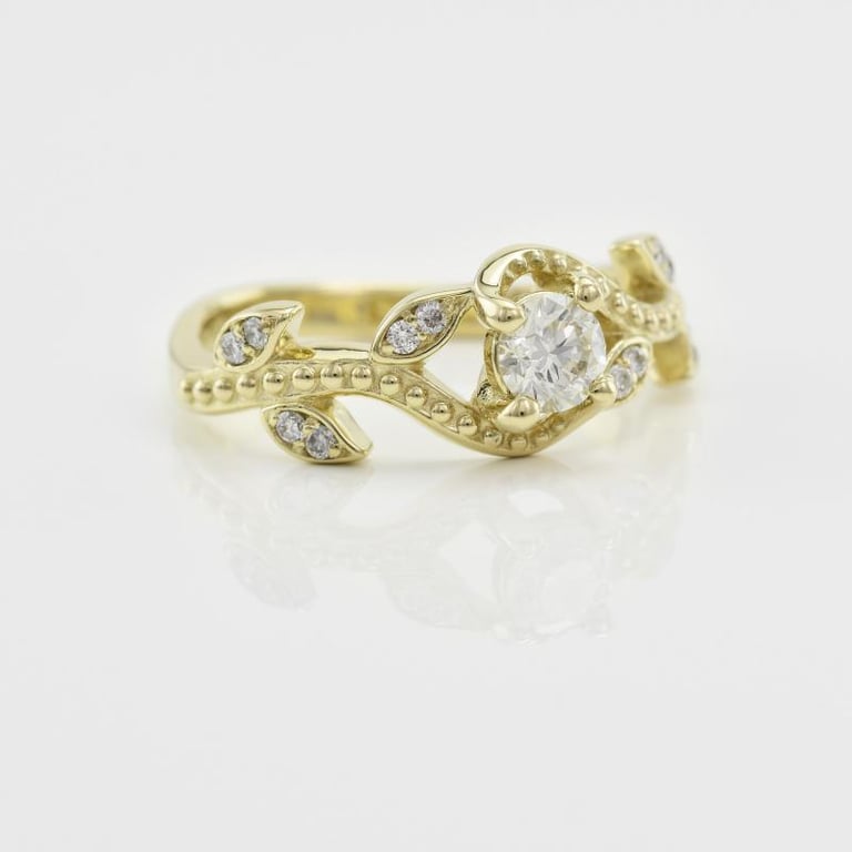 • die fein gearbeiteten Stiele mit Blättern winden sich um den funkelnden Diamanten