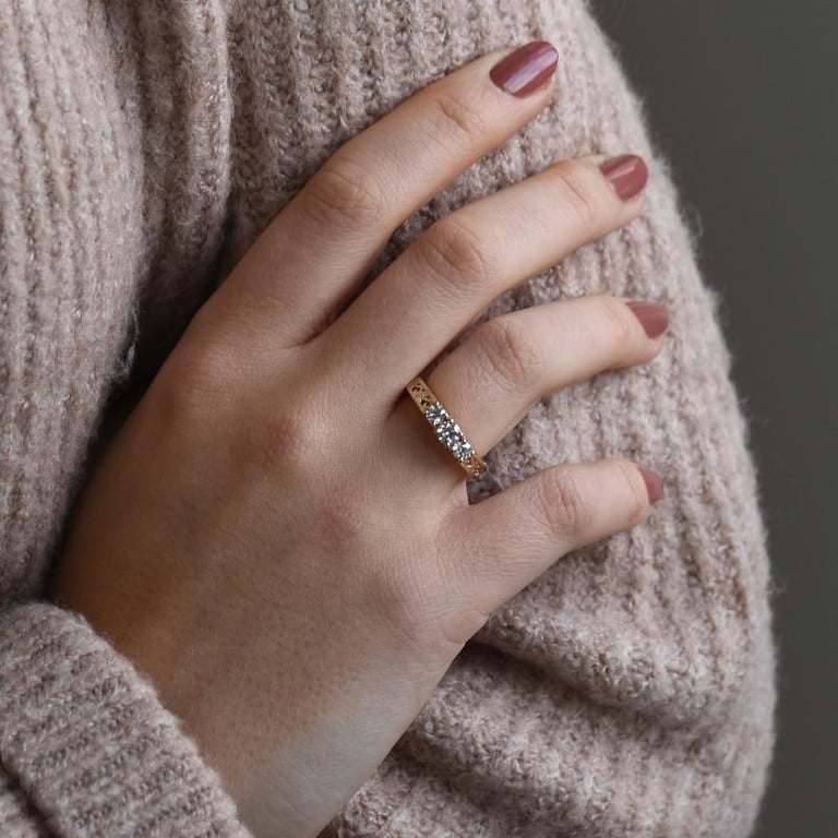• der atypische Ring ist mit drei markanten Diamanten verziert