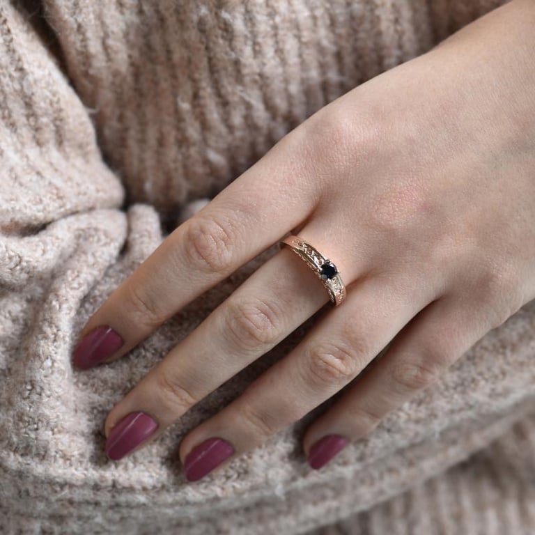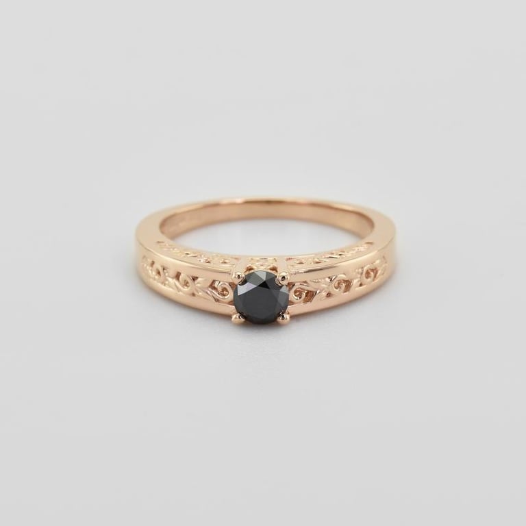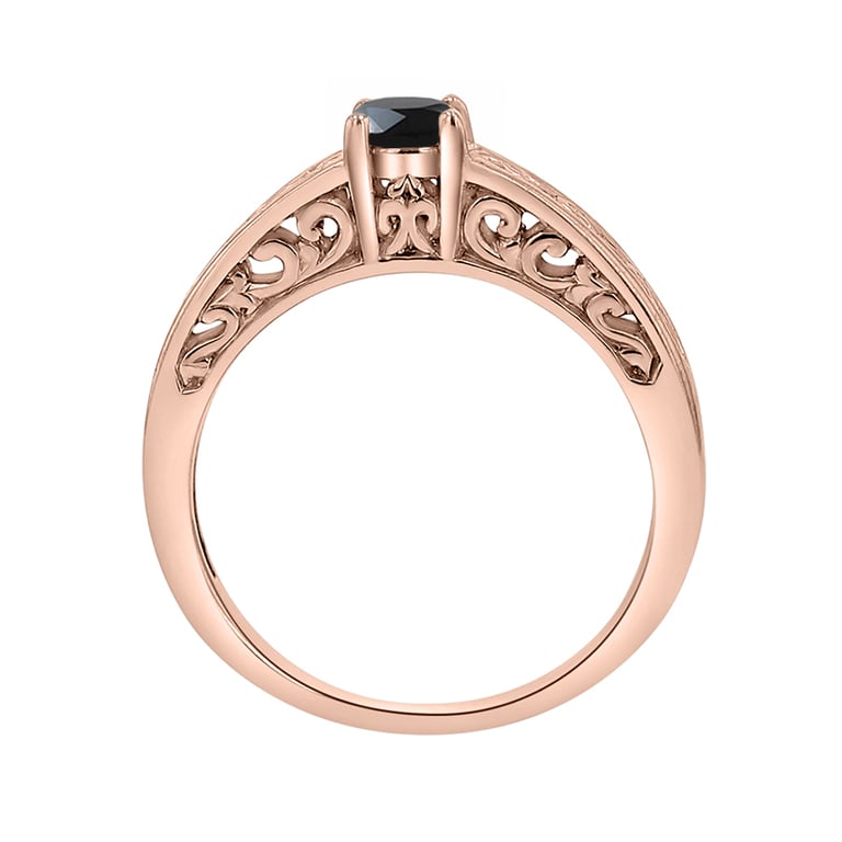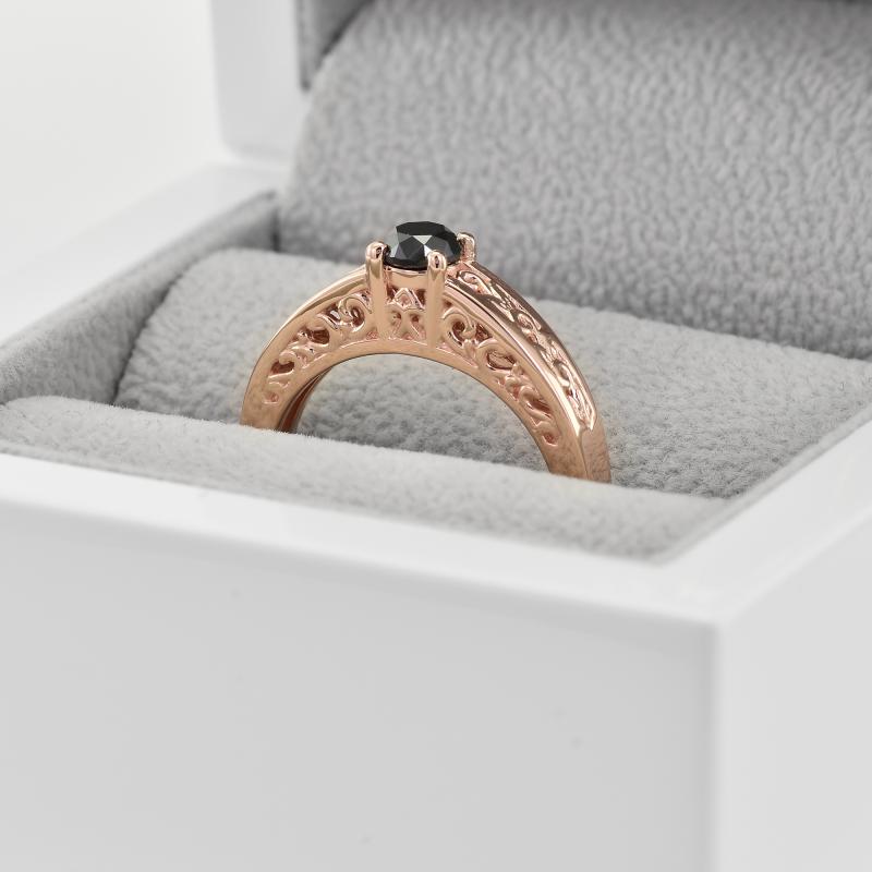 • der Ring in Roségold hat eine verzierte Ringschiene mit floralen Elementen und einem schwarzen Diamanten im Zentrum