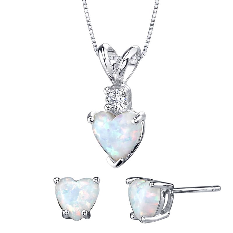 • Opalcabochons als Herzen zieren Ohrstecker und Anhänger, der zudem einen runden Diamanten hat