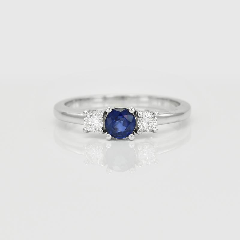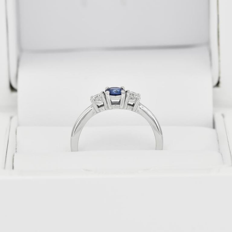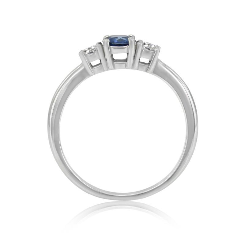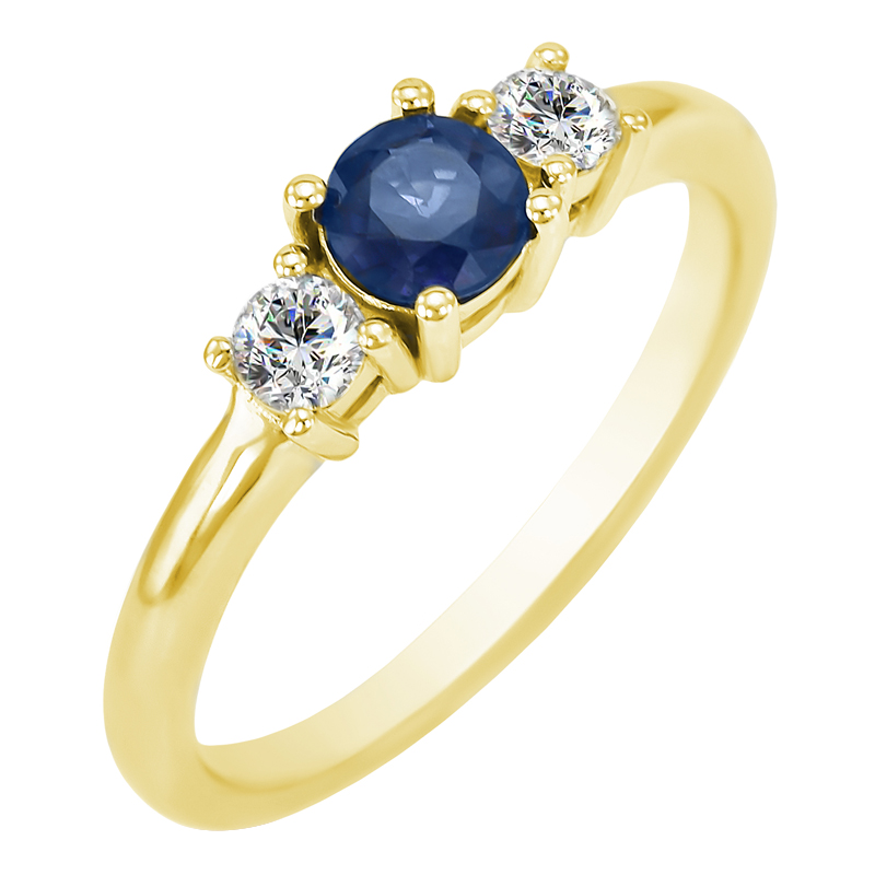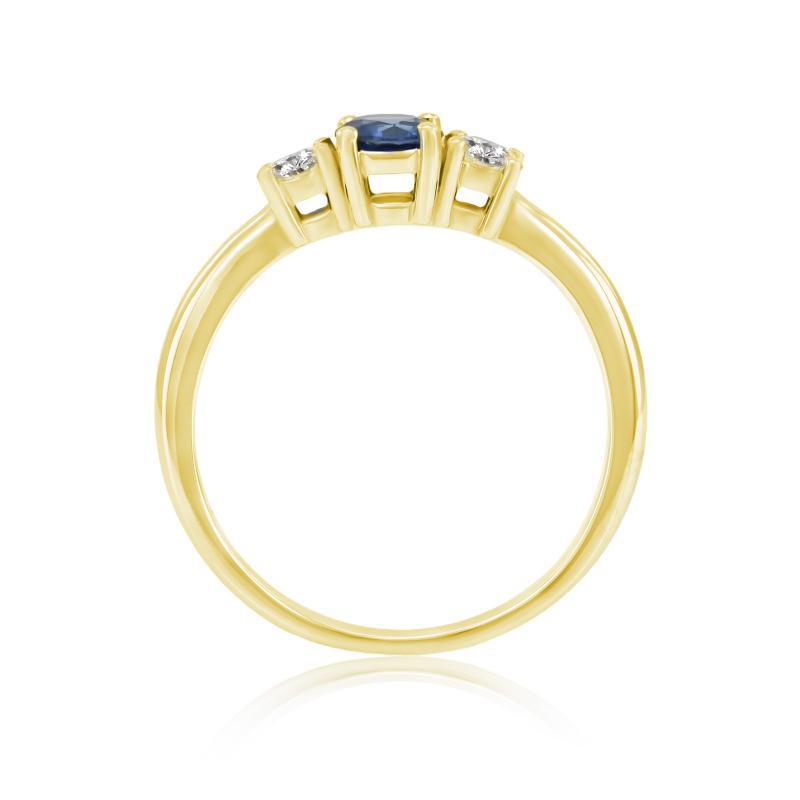 • der elegante Ring aus Gold mit einem geschliffenen Saphir wird an jeder Seite von einem Diamanten umrahmt