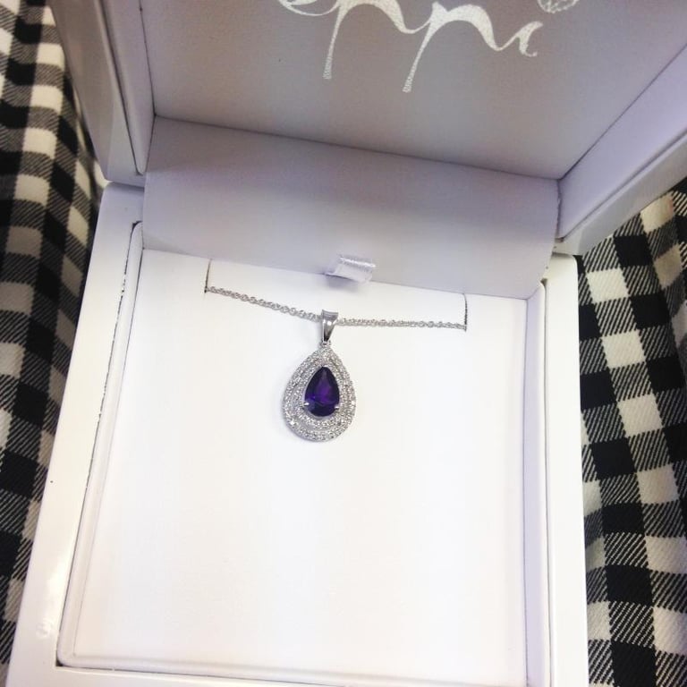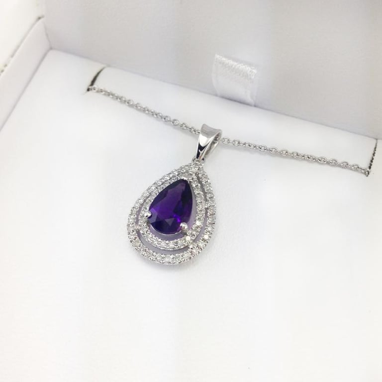 • ein verführerischer Amethyst in Tränenform strahlt in einem doppelten Halo aus Diamanten in diesem Goldanhänger