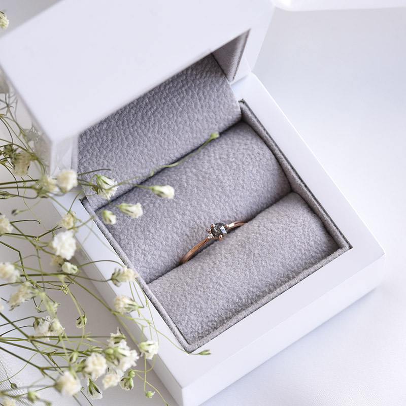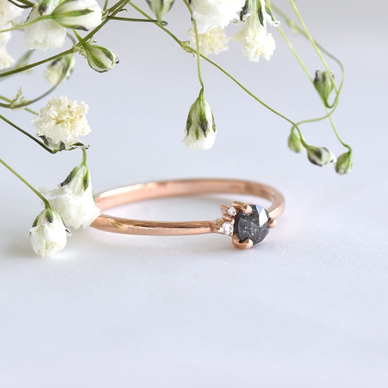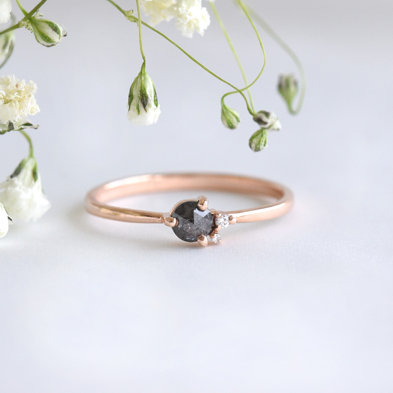• ein romantischer Ring mit Salt and Pepper Diamant und glänzenden Seitendiamanten