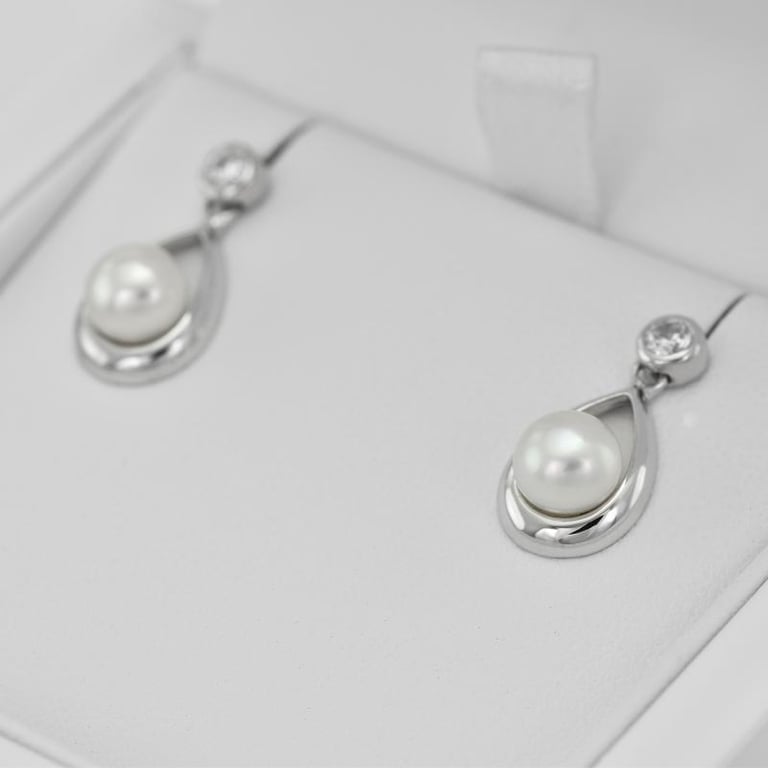 • je eine weiße Perle hängt in einer silbernen Schlaufe, die von je einem Zirkonia gekrönt wird