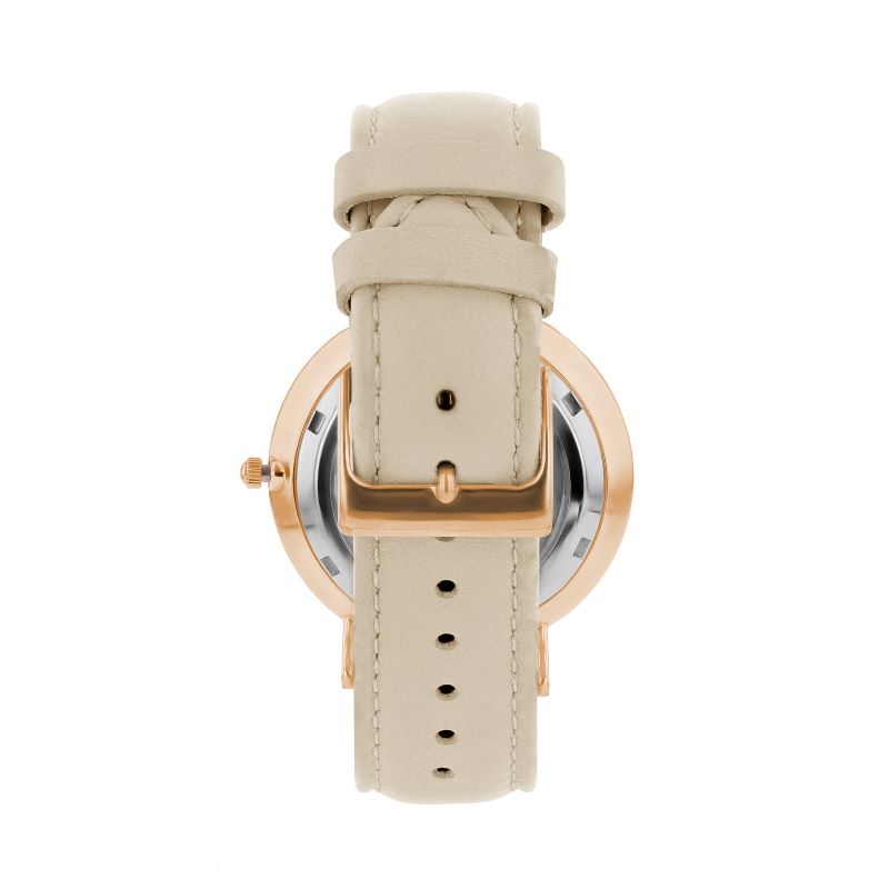 - Gehäuse aus rosafarbenem Edelstahl mit einem beigefarbenen Armband aus Nappaleder