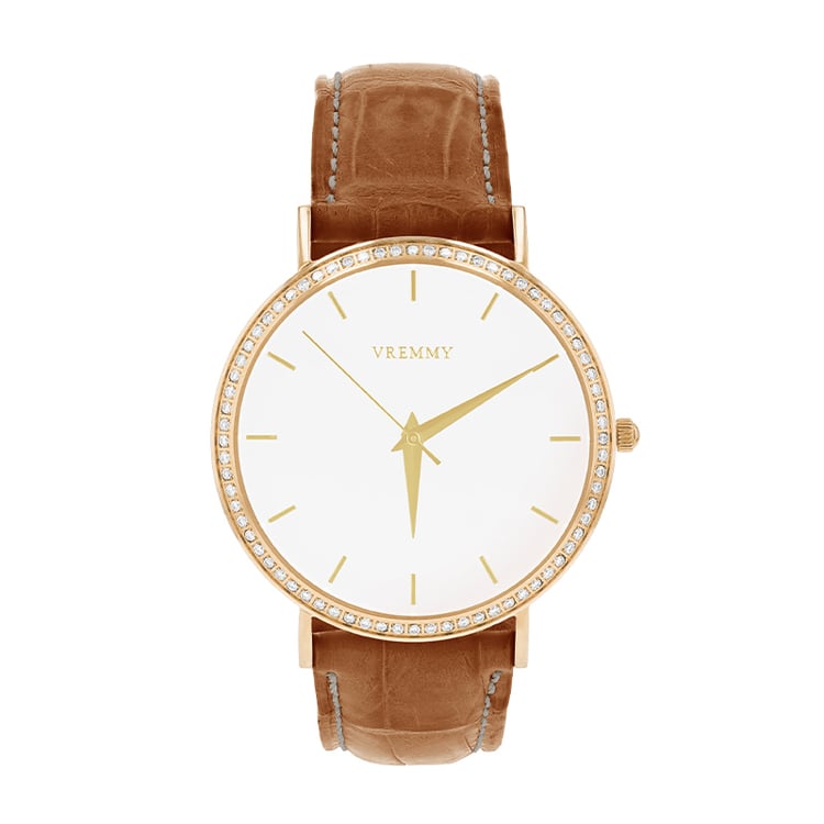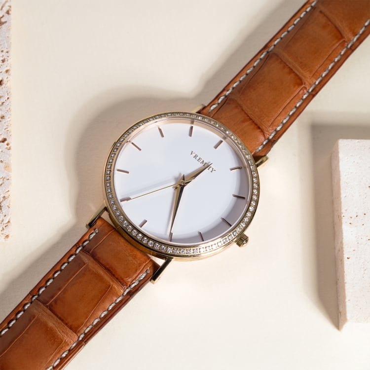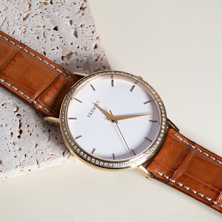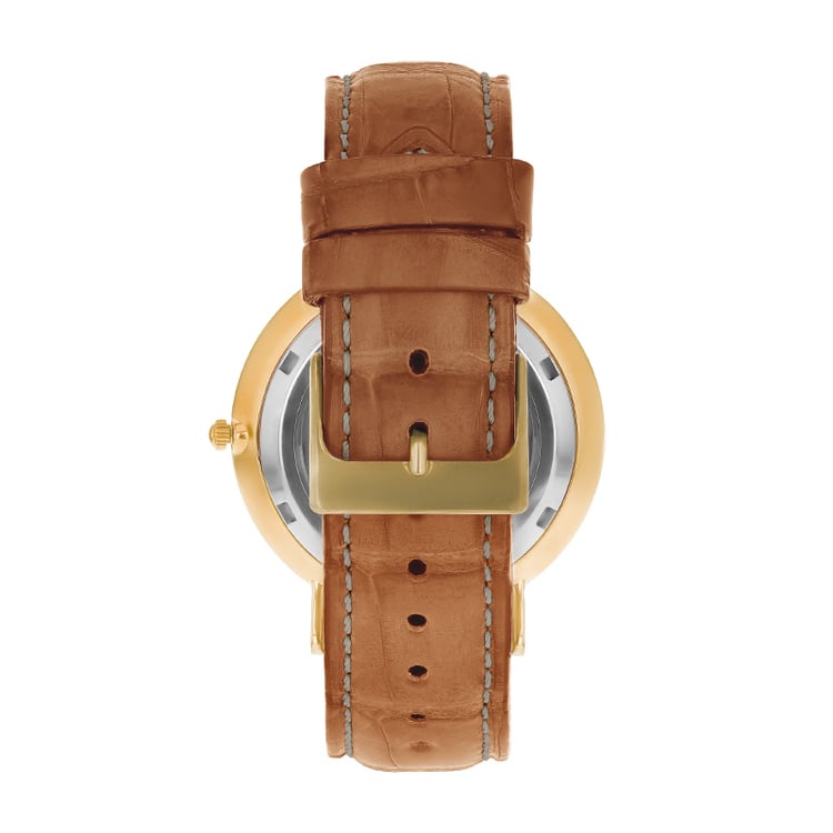 - das Edelstahlgehäuse in gelber Farbe harmoniert mit dem cognacfarbenen Armband aus Krokodilleder