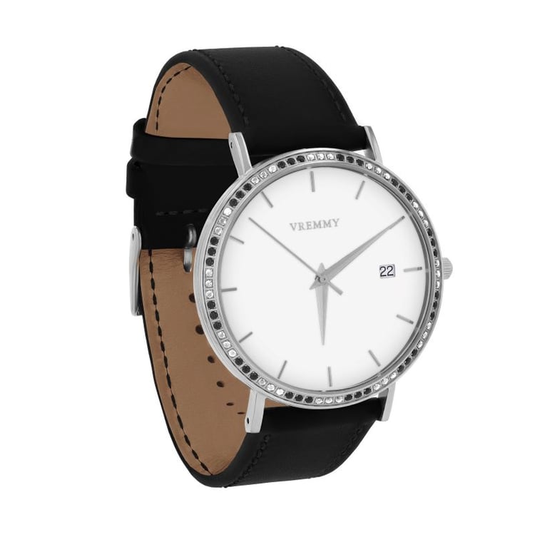 - Edelstahlgehäuse mit einem schwarzem Lederarmband